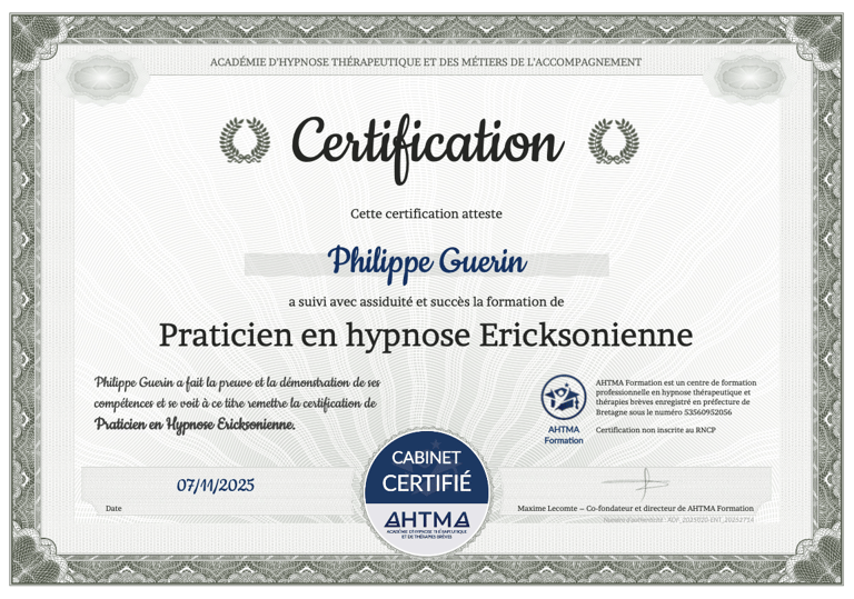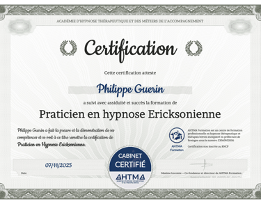Après avoir validé ma formation de technicien, j’ai souhaité aller plus loin et approfondir mes compétences en hypnose en passant le niveau praticien. J’ai choisi de me former auprès de l’Ahtma, une école qui s’est rapidement imposée comme une évidence pour moi.